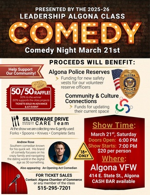Bring your friends, grab a drink, and enjoy a night of laughs while supporting two important community projects right here in Algona!