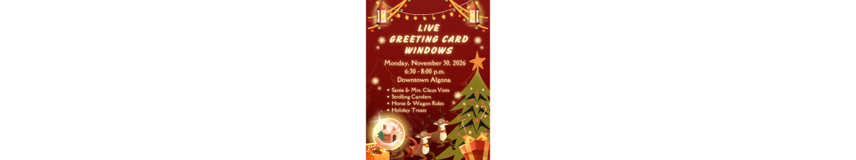 Downtown Algona comes alive with holiday magic as State Street windows are transformed into festive scenes for all to enjoy. Stroll through downtown and take in the decorated storefronts while sipping hot cider or hot chocolate and enjoying popcorn and cookies. Along the way, enjoy a holiday-themed horse-drawn wagon ride or pause to listen to musical carolers strolling the streets. Keep an eye out — Santa and Mrs. Claus may even make a special appearance.