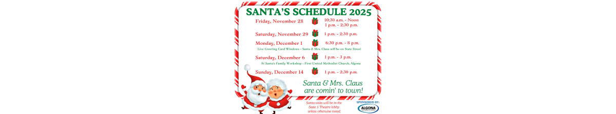 The magic of Christmas is returning to Algona this holiday season! Santa & Mrs. Claus will be making special stops at their Algona “home base” — the State 5 Theatre Lobby — to visit with children and families.