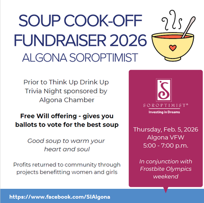 Join us for a Weekly Chamber Coffee hosted by Soroptimist International of Algona at the Algona Welcome Center on Friday, January 16, starting at 9:30 a.m.